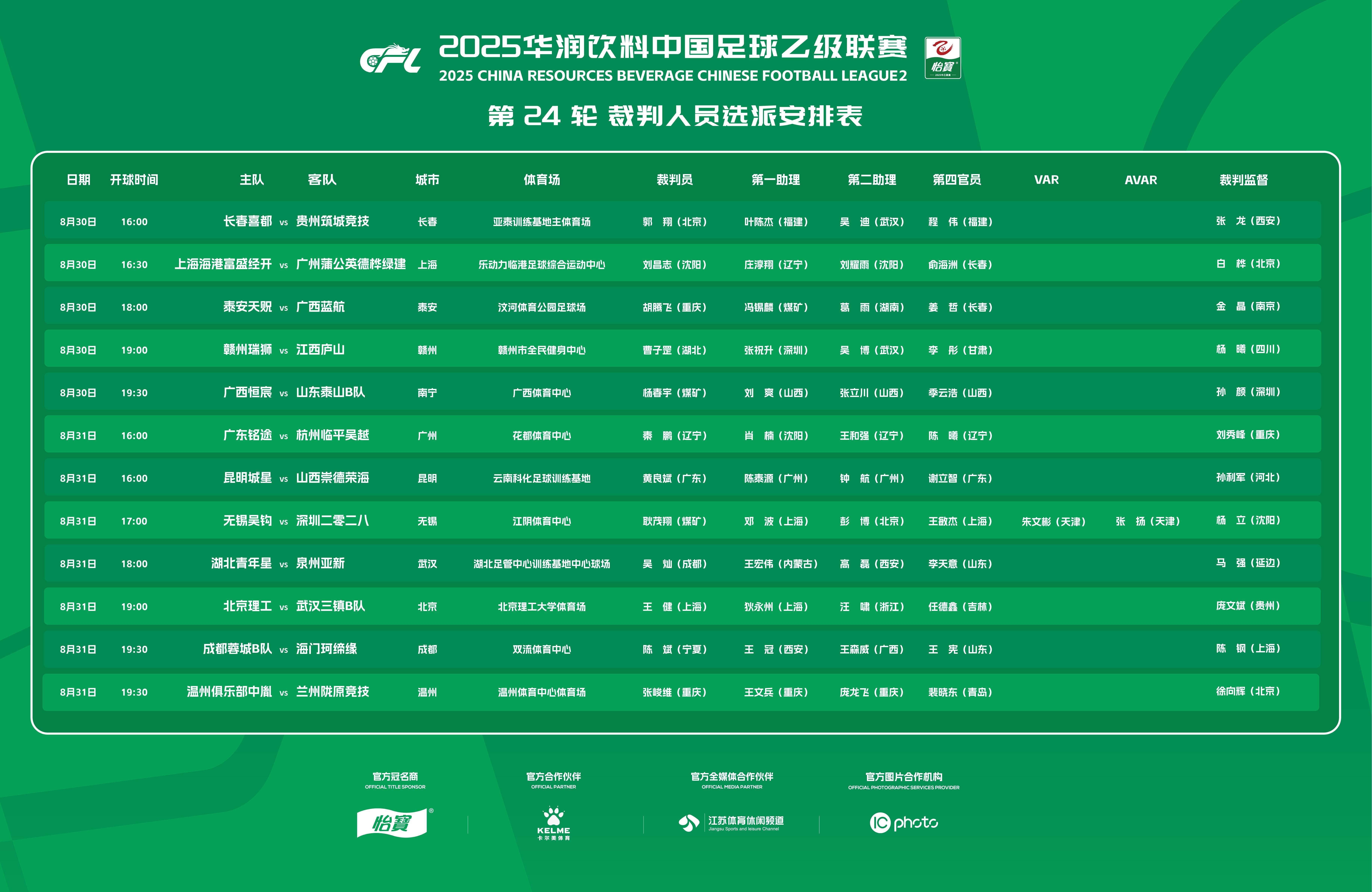 北京时间8月30日,中国足球乙级联赛第24轮裁判名单公布,耿茂翔执法无锡vs深圳,杨春雨吹广西vs山东。